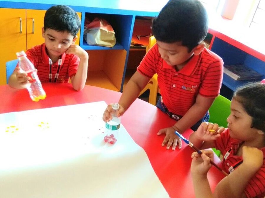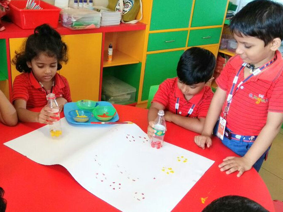 The children were made to do an activity where they had to dip the bottom of the bottle in paint and print flowers on the chart paper. Then they drew butterflies and honey bees all around the flowers. This activity enhanced their naturalistic, visual and fine motor skills.