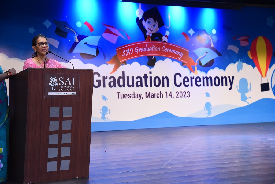 SAI Angan held a noteworthy kindergarten graduation ceremony for KG II students on March 14, 2023. Little graduates from 9 sections of KG-II were called upon the stage to receive their well-deserved accolades. Their parents were proud spectators of the Moving-Up Ceremony. From the tassel on the graduation cap to hearing the ceremonial music of “Pomp and Circumstance” for the first time, the graduation ceremony was a special moment both for the little ones & their parents who cheered our little graduates as they don their capes and hats to face the world. Their smiling faces of the tiny tots were welcomed by rapturous applause from the audience as they received scrolls of merit on the dais. It was indeed a joyous and memorable day for the little ones as they received their Graduation certificates from Smt. Rashmi Pandey, Principal Primary, SAI International School, who acknowledged their hard work & dedication & congratulated them congratulated them on entering the Class-I League.