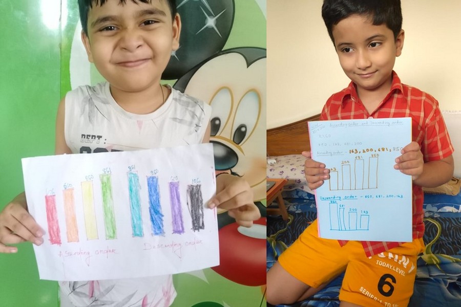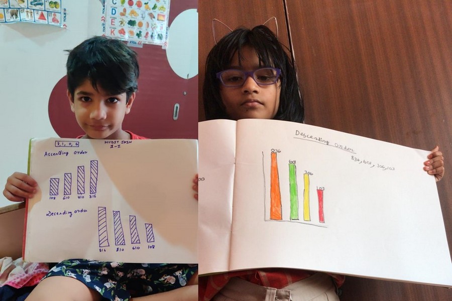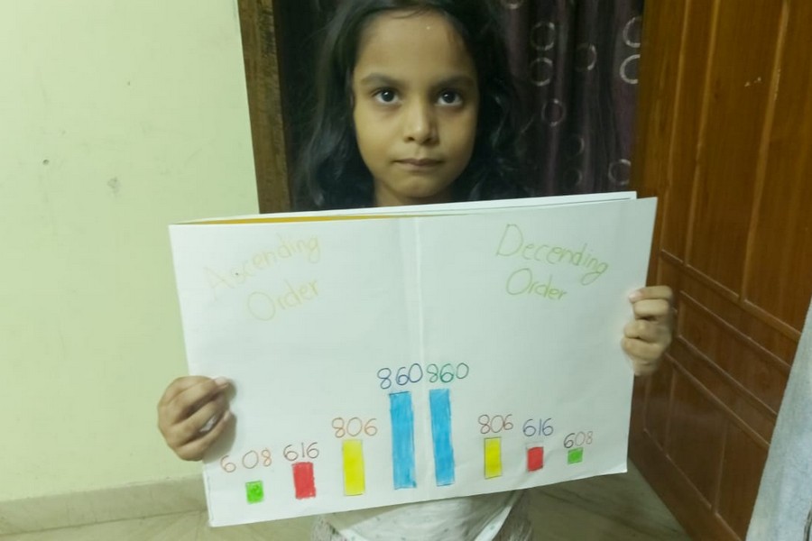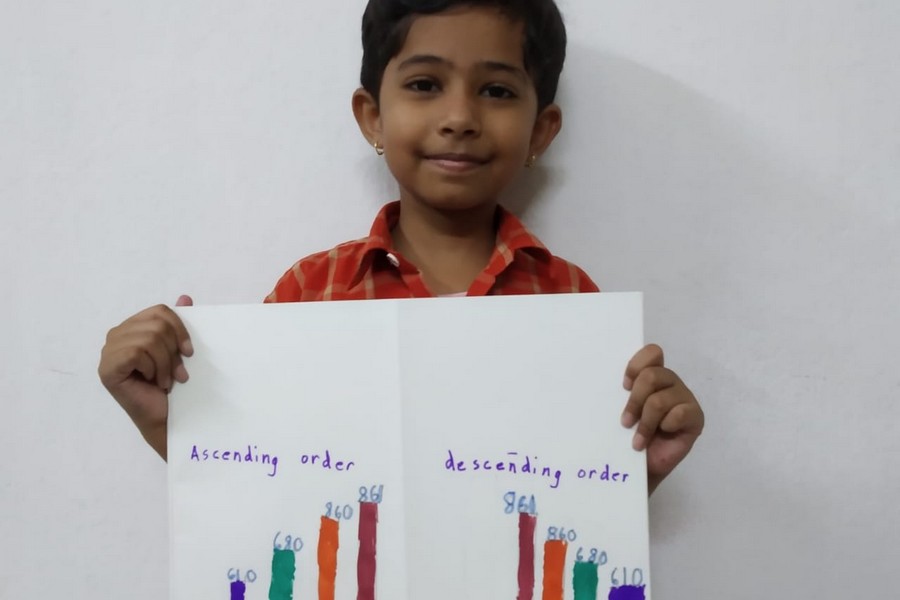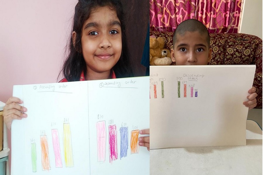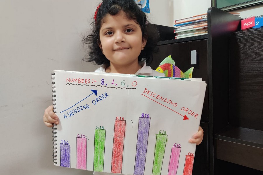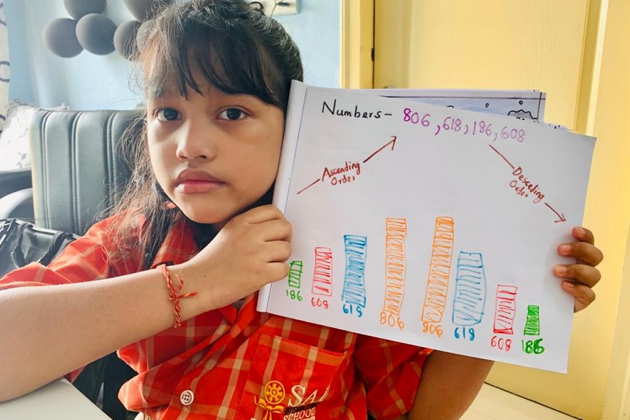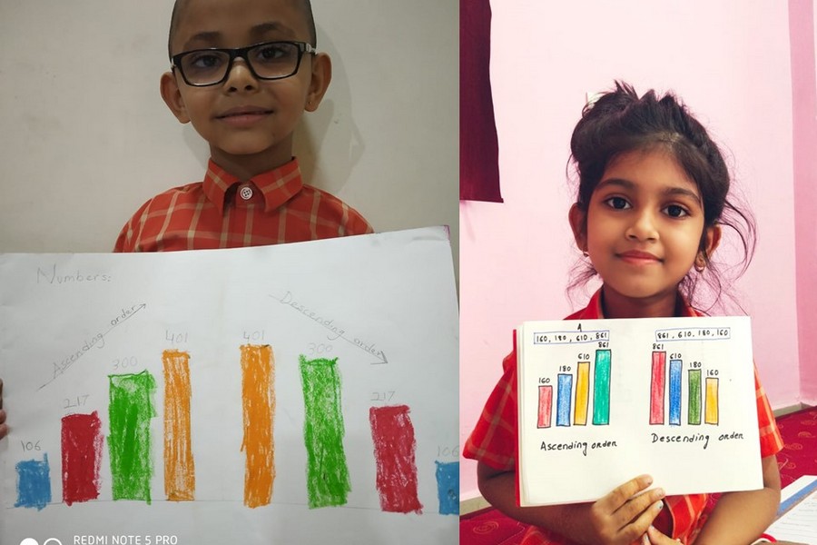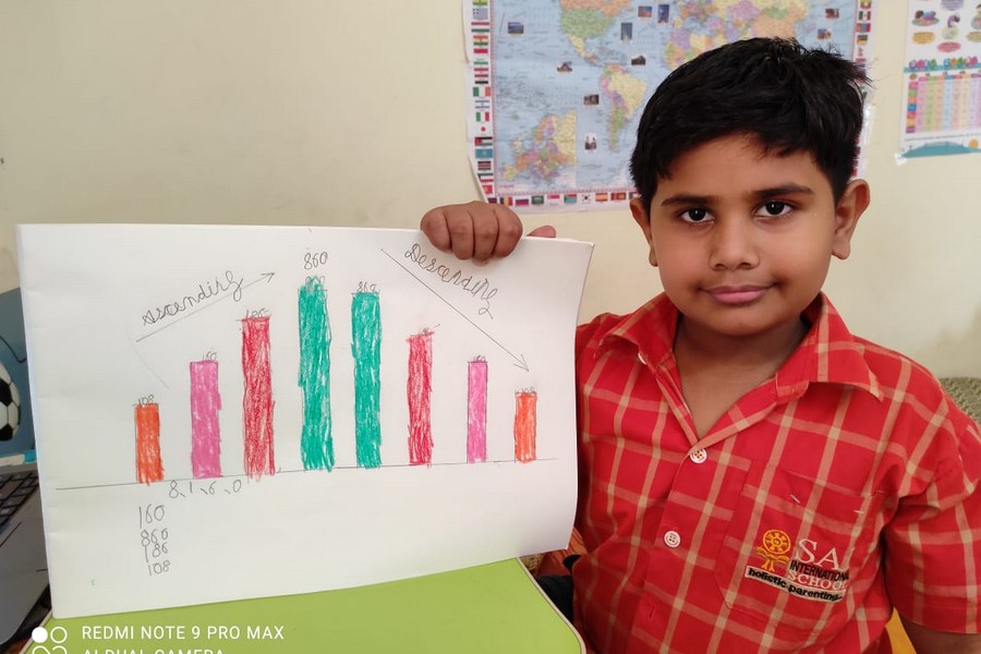 Understanding concepts allow the student to organize issues or ideas in a broad way. To explain the concept of Comparing numbers the students of Class-I were introduced with the story of Hungry Crocodile which was followed by the activity using the mouth of the crocodile to compare numbers as symbols of greater than, less than or equal to. Thinking life beyond the classroom the SAIoneers were able to point out the proper order of things around them in ascending order and descending order. The activity of arranging leaves, playdough and paper balls in ascending order and drawing the picture of family members in descending order has assisted the tiny observers to arrange numbers accordingly. The ingenious schooling by the SAI Angan teachers is certainly estimable.