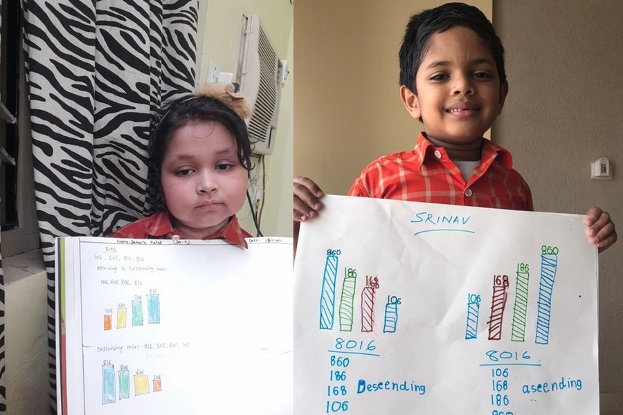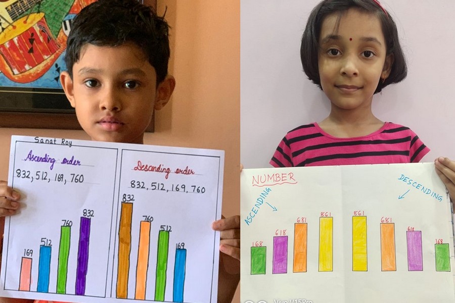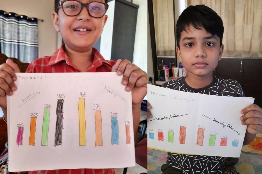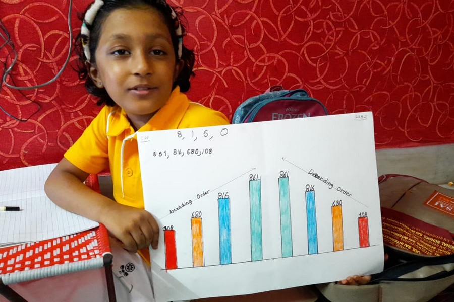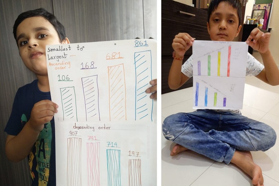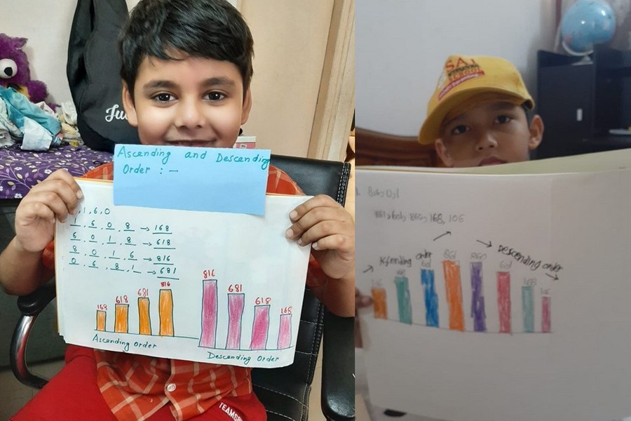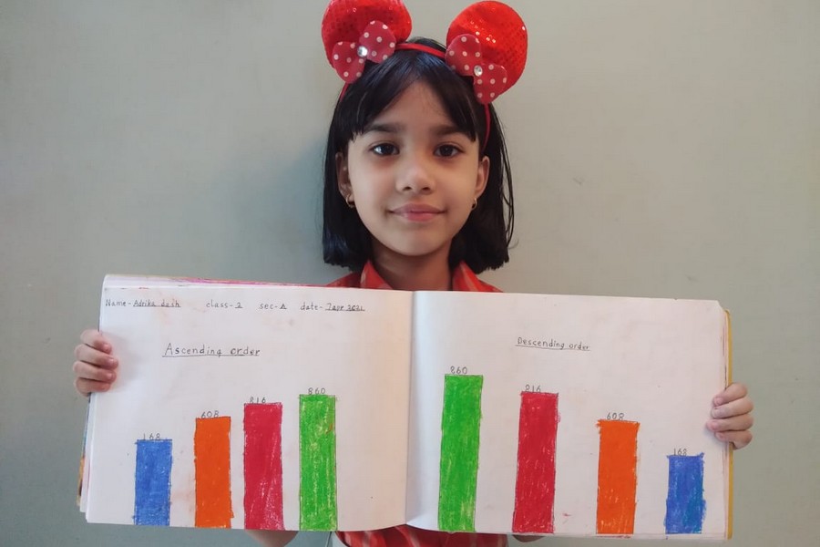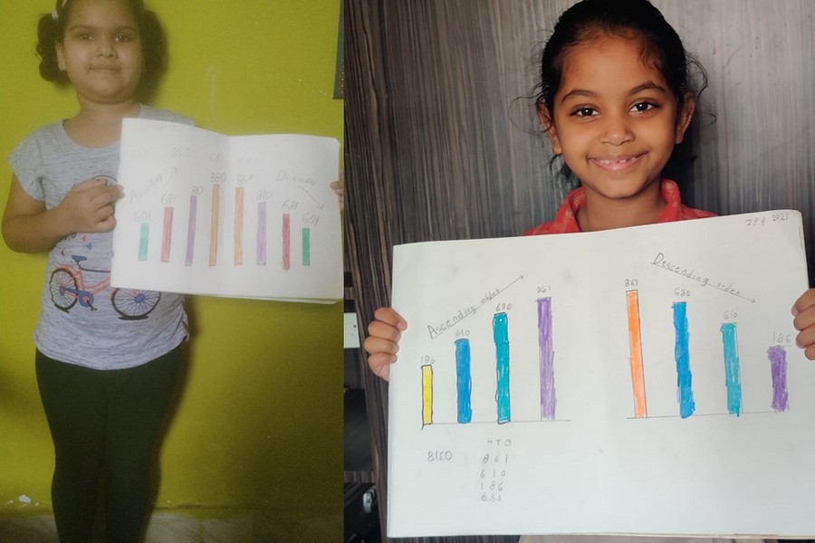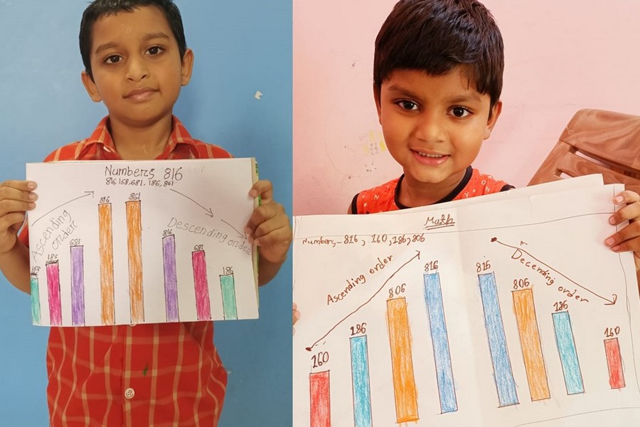 Understanding concepts allow the student to organize issues or ideas in a broad way. To explain the concept of Comparing numbers the students of Class-I were introduced with the story of Hungry Crocodile which was followed by the activity using the mouth of the crocodile to compare numbers as symbols of greater than, less than or equal to. Thinking life beyond the classroom the SAIoneers were able to point out the proper order of things around them in ascending order and descending order. The activity of arranging leaves, playdough and paper balls in ascending order and drawing the picture of family members in descending order has assisted the tiny observers to arrange numbers accordingly. The ingenious schooling by the SAI Angan teachers is certainly estimable.