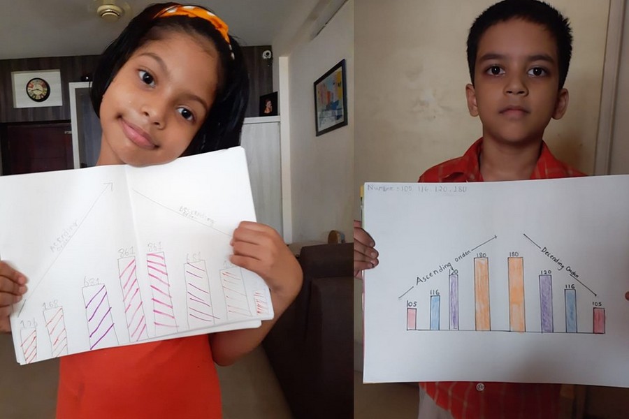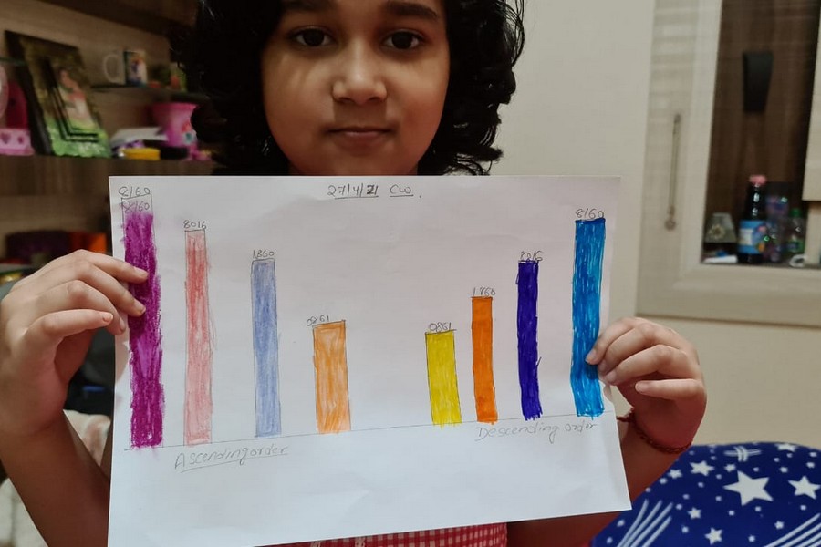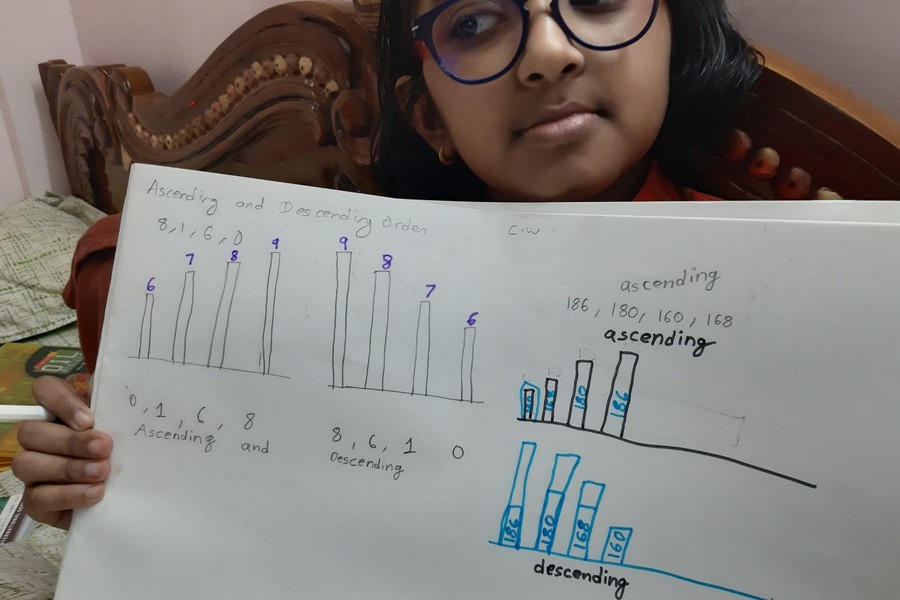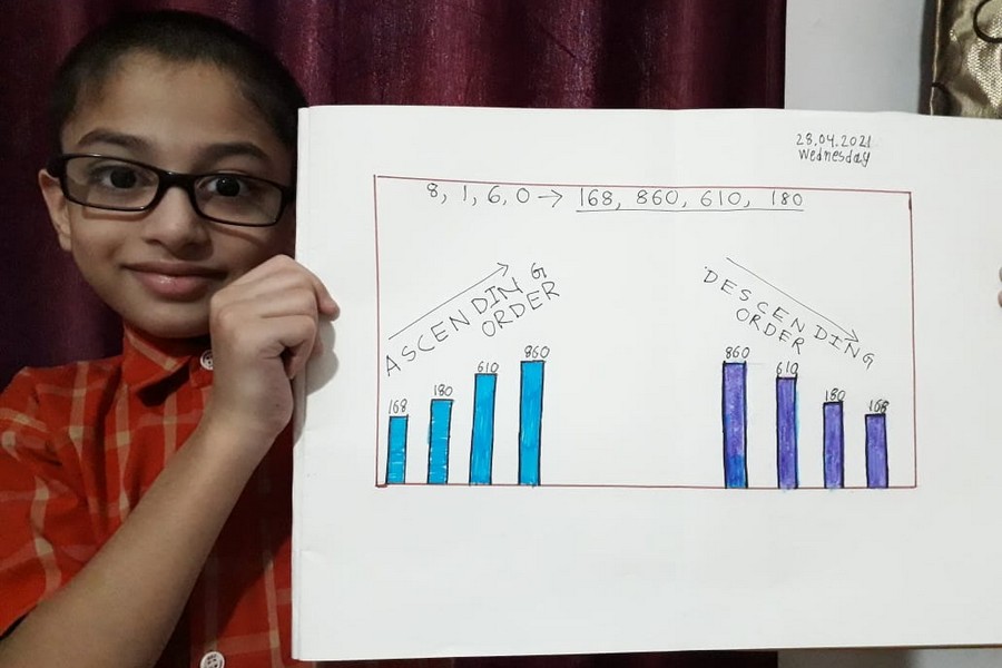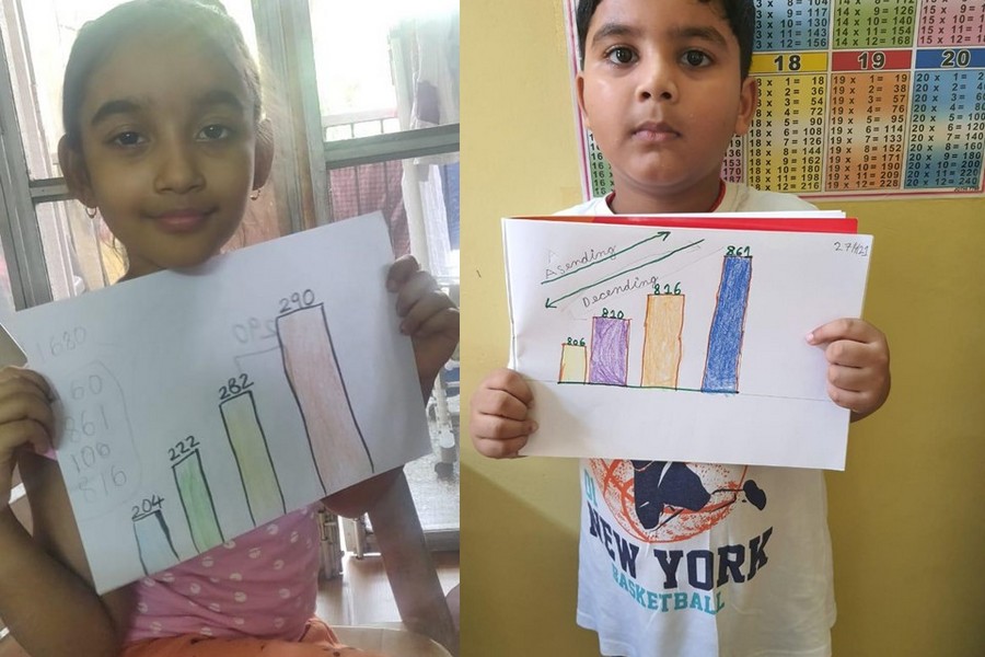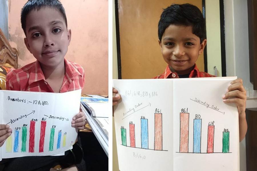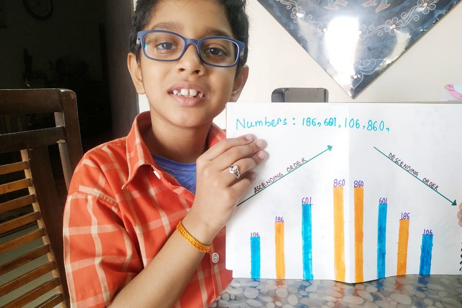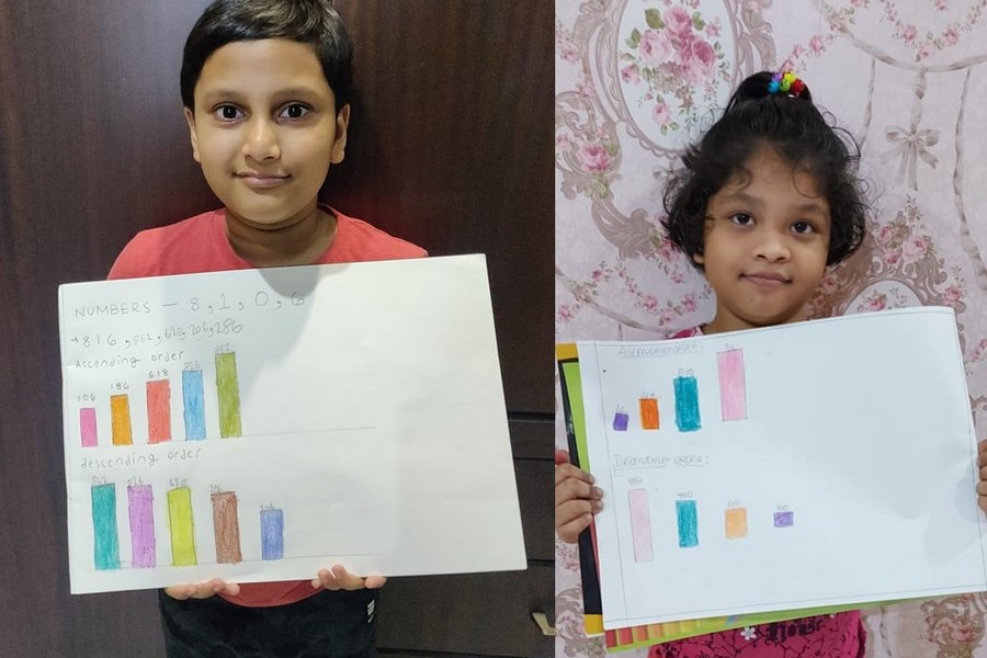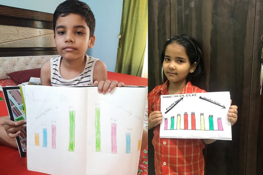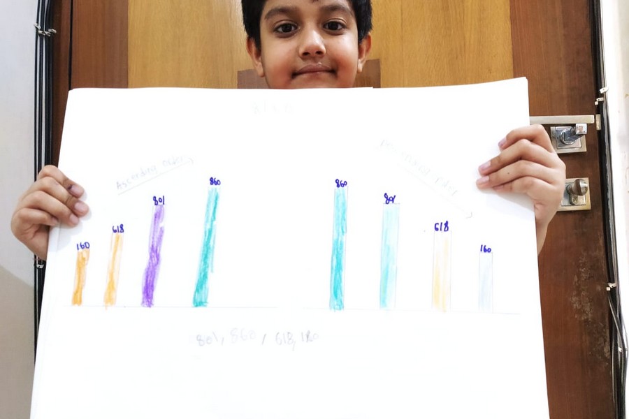Understanding concepts allow the student to organize issues or ideas in a broad way. To explain the concept of Comparing numbers the students of Class-I were introduced with the story of Hungry Crocodile which was followed by the activity using the mouth of the crocodile to compare numbers as symbols of greater than, less than or equal to. Thinking life beyond the classroom the SAIoneers were able to point out the proper order of things around them in ascending order and descending order. The activity of arranging leaves, playdough and paper balls in ascending order and drawing the picture of family members in descending order has assisted the tiny observers to arrange numbers accordingly. The ingenious schooling by the SAI Angan teachers is certainly estimable.