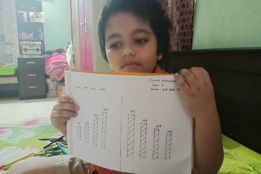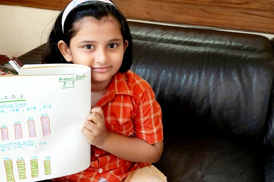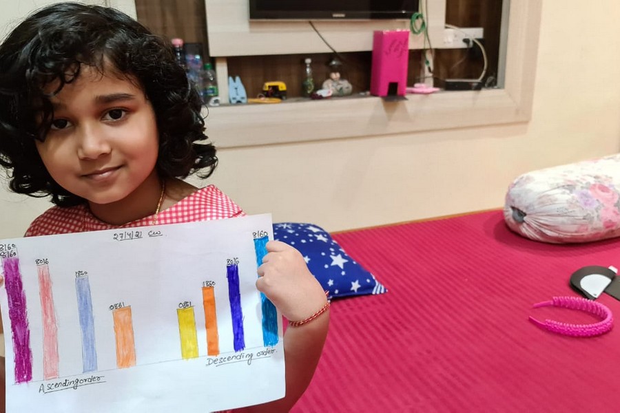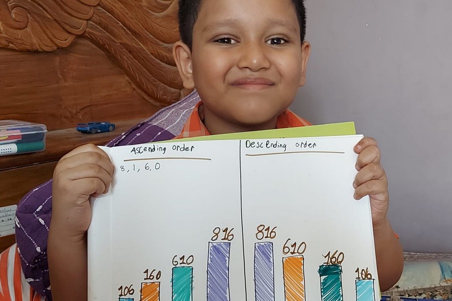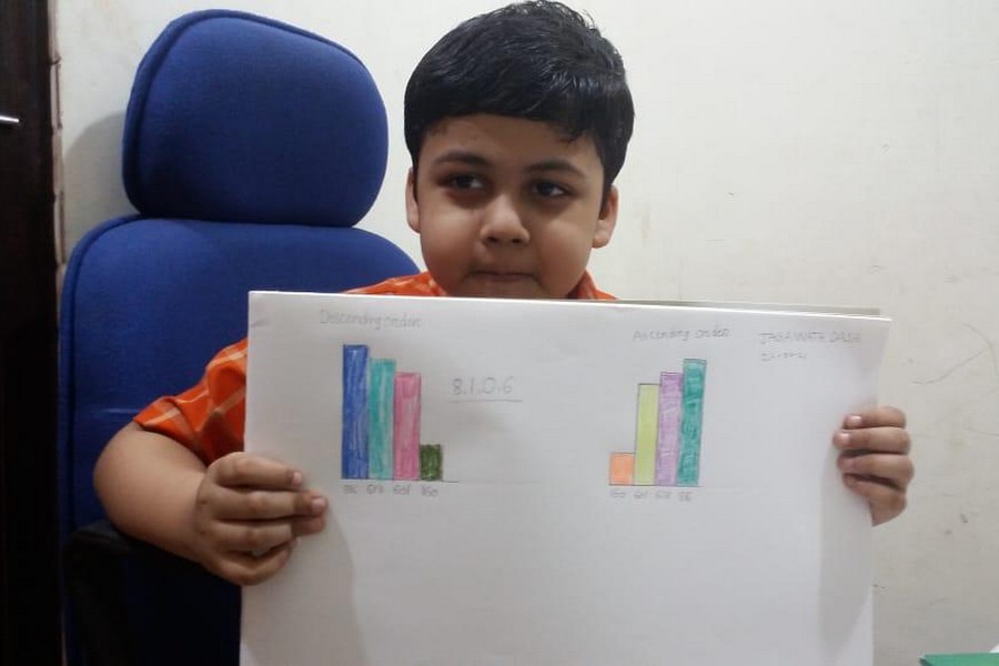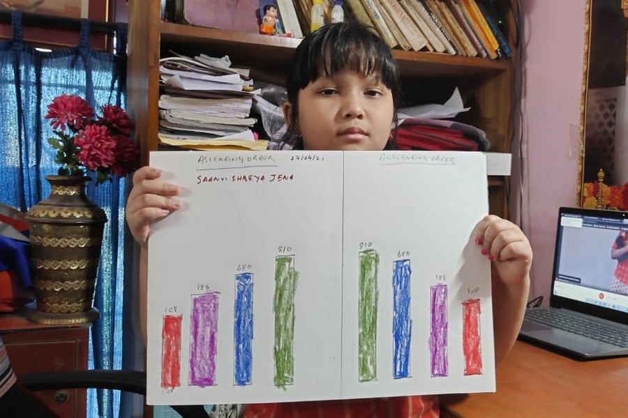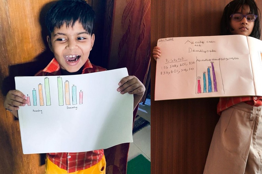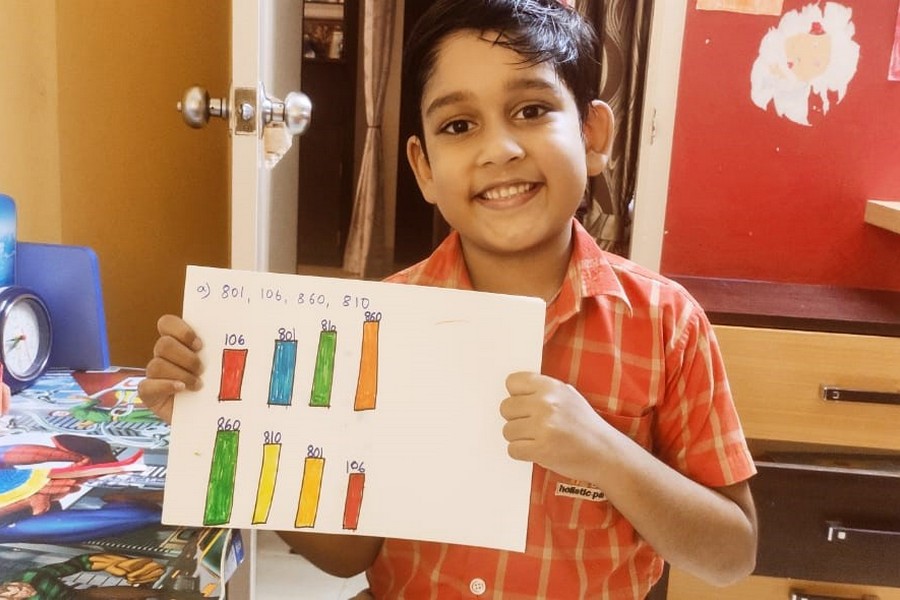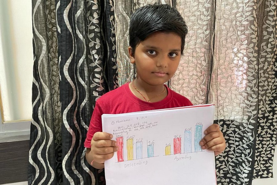 Understanding concepts allow the student to organize issues or ideas in a broad way. To explain the concept of Comparing numbers the students of Class-I were introduced with the story of Hungry Crocodile which was followed by the activity using the mouth of the crocodile to compare numbers as symbols of greater than, less than or equal to. Thinking life beyond the classroom the SAIoneers were able to point out the proper order of things around them in ascending order and descending order. The activity of arranging leaves, playdough and paper balls in ascending order and drawing the picture of family members in descending order has assisted the tiny observers to arrange numbers accordingly. The ingenious schooling by the SAI Angan teachers is certainly estimable.