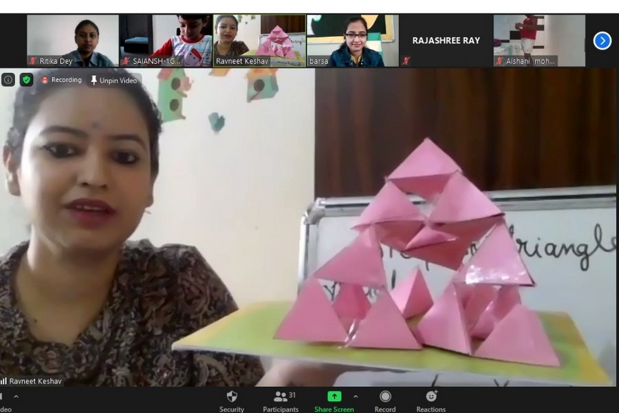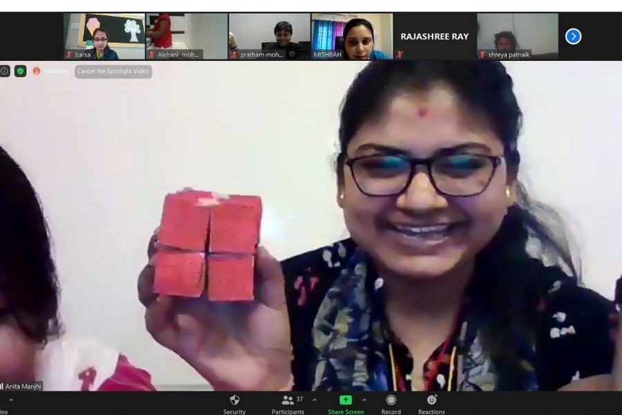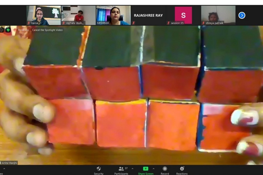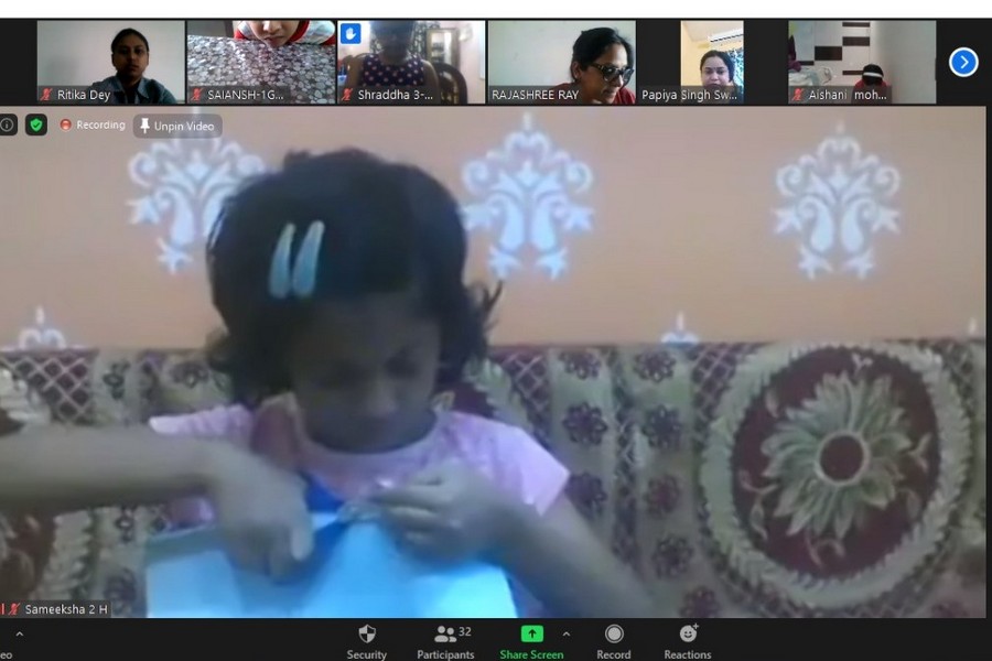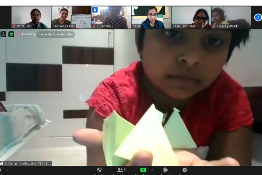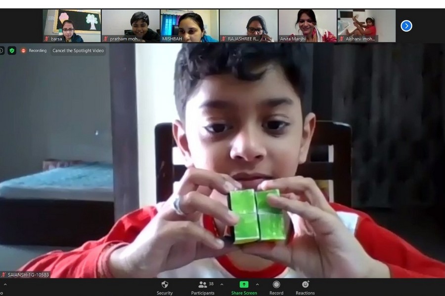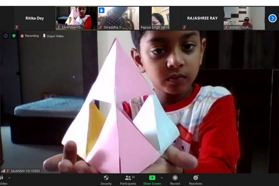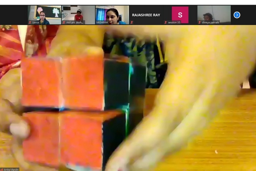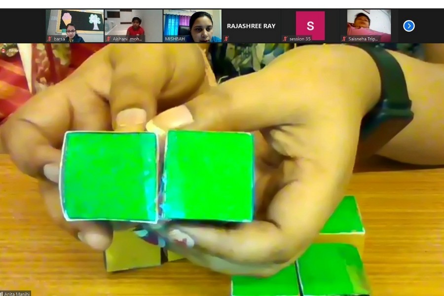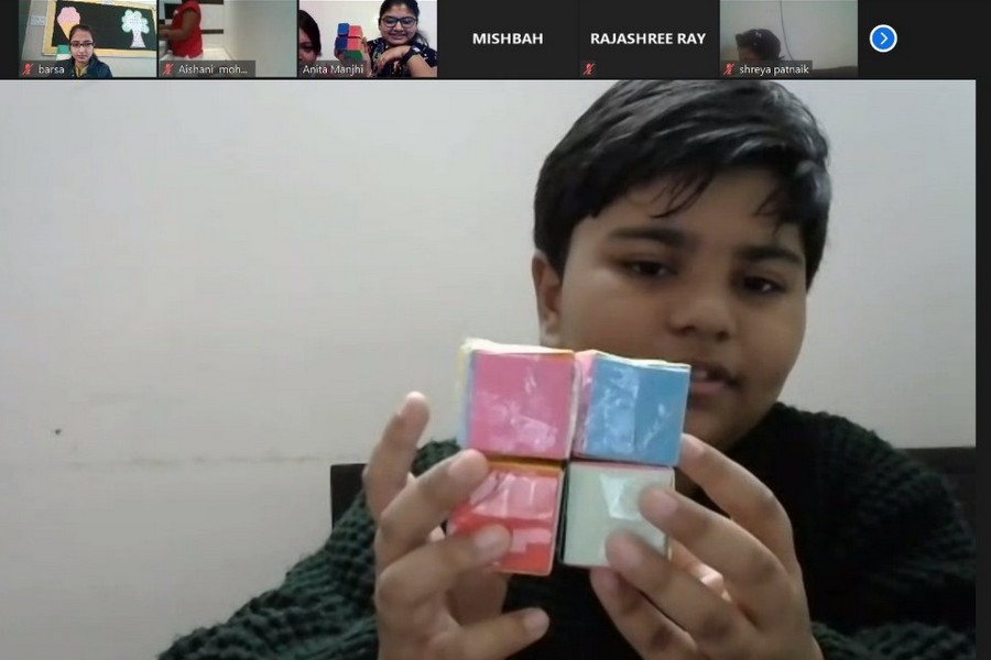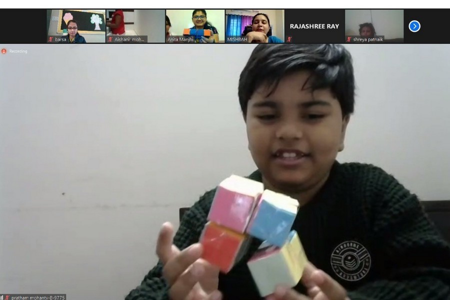 The students of Class I made a Rubik’s cube during their online session. They made eight cubes of the same size and coloured each side with a different colour. They were asked to attach the cubes in a certain way with cello tape. It was attached in such a way that it could move freely. The students were amazed to see a Rubik’s cube made with paper.