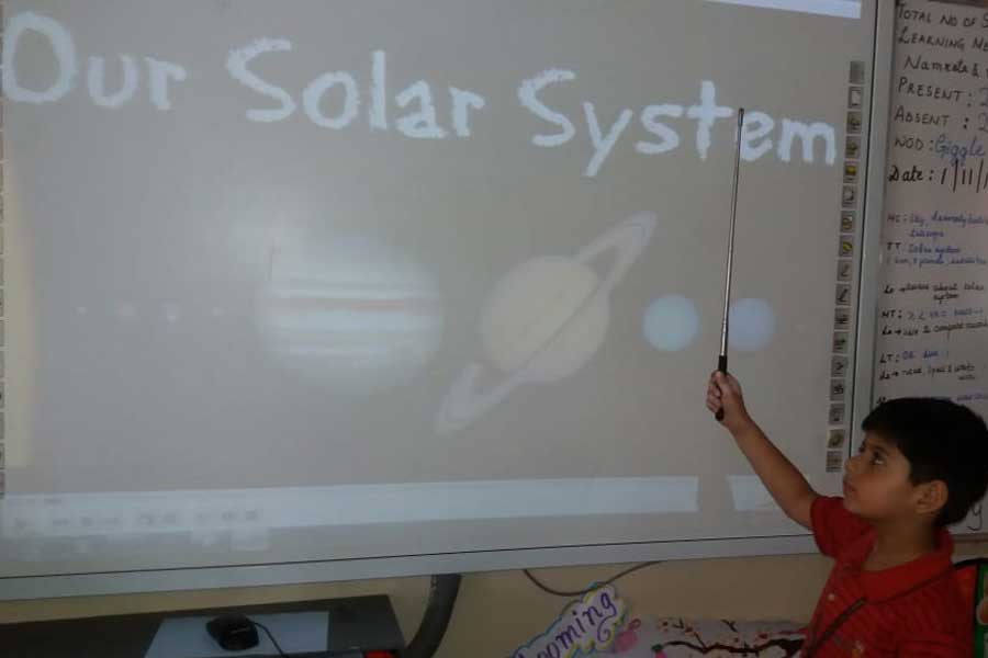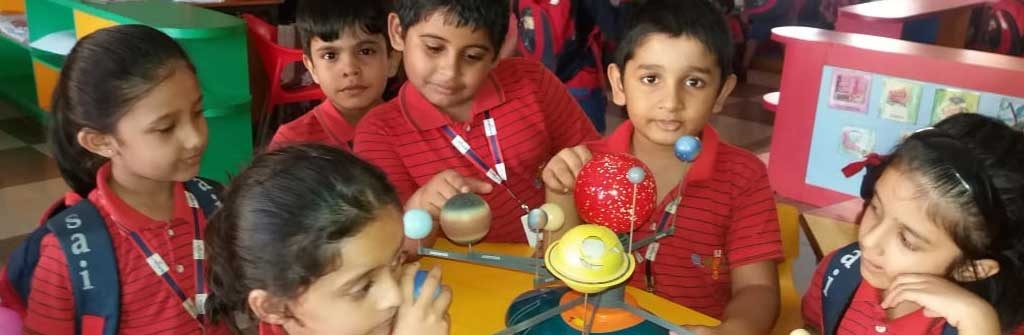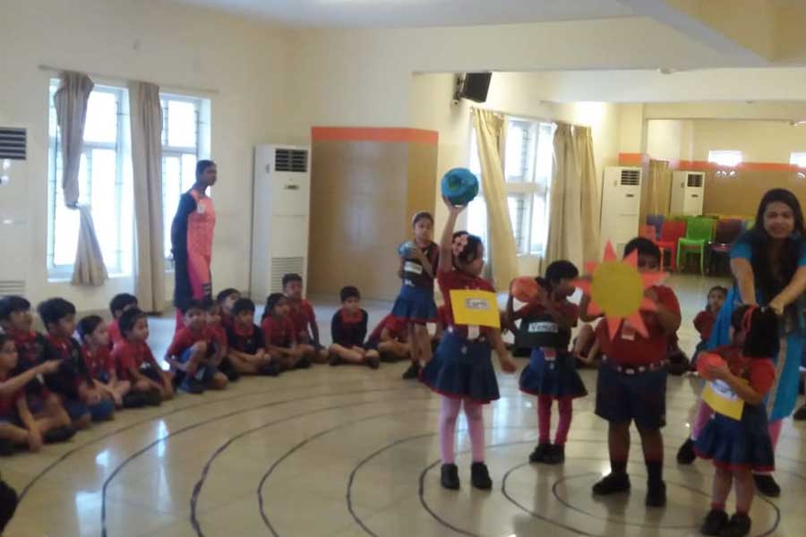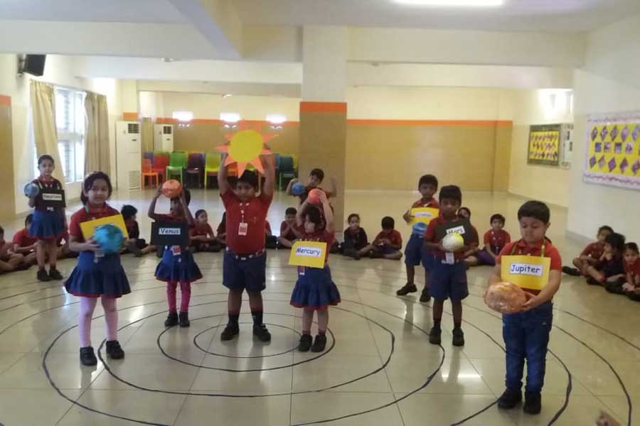 To cultivate their interest and help the students to understand the Solar System, an activity was conducted for students of KG II. Orbits were drawn on the floor in the school auditorium and models of eight planets were hung around the student’s neck. They arranged themselves according to their position near the sun. Children were instructed to rotate around the sun clockwise and anti-clockwise. In this way they learnt about the different position of each planet around the Sun and that the huge ball of fire at the centre is the head of the family.