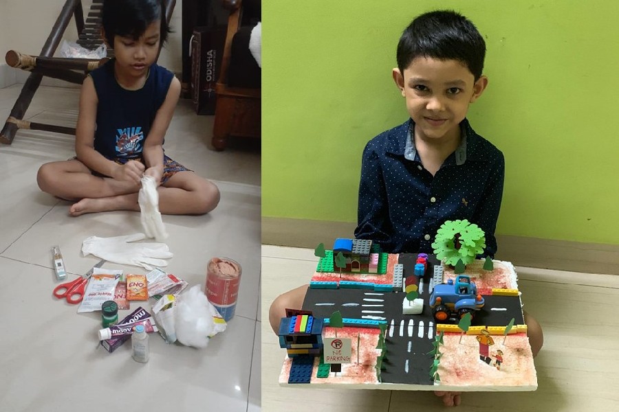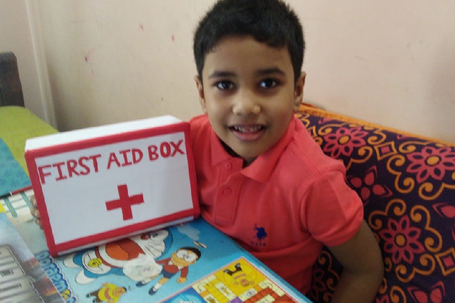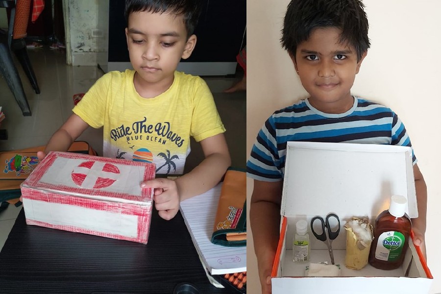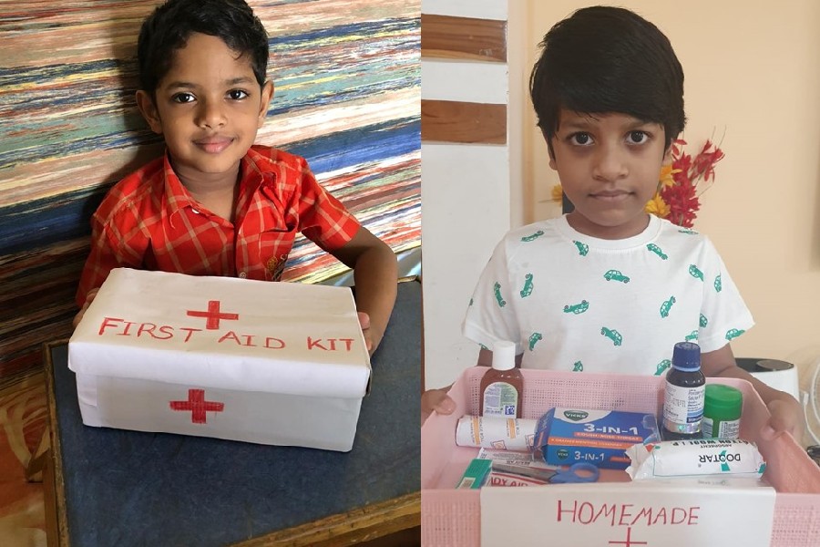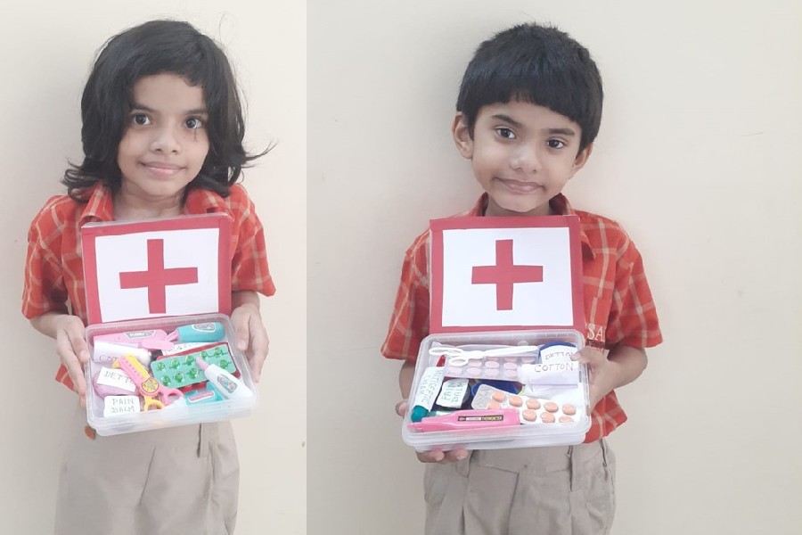 An activity was organized for Class l students where children were asked to make a first-aid box out of a cardboard box available in their home. This activity helped children in understanding the importance and use of various things in the box. Students thoroughly enjoyed the interactive session which helped them to enhance their understanding and uses of content of first aid box. It also increased their naturalistic and visual skills.