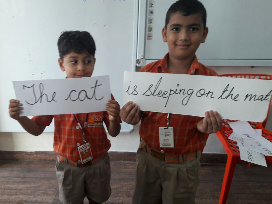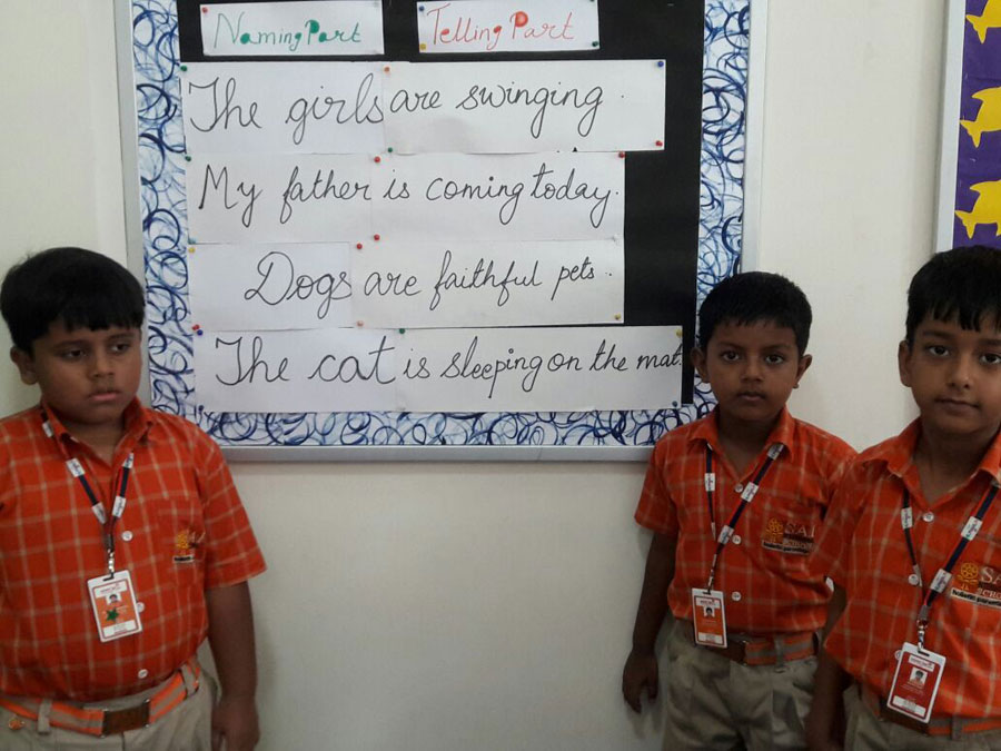 An activity was conducted for students of Class-I, to help them learn how to frame correct sentences using Naming Part and Telling Part. Through interesting examples, they learnt every sentence has a naming part and a telling part. Students were provided with strips of cutouts with naming part or telling part written on it and were asked to match the naming part with the correct telling part to make a complete sentence. Through this activity students learnt how to frame a correct sentence using the naming and doing words. They also learnt that a correct sentence begins with a capital letter, ends with a full stop and should convey a proper sense. The students thoroughly enjoyed doing this activity which helped them to enhance their linguistic and creative skills.