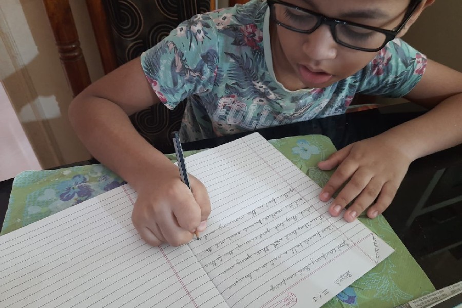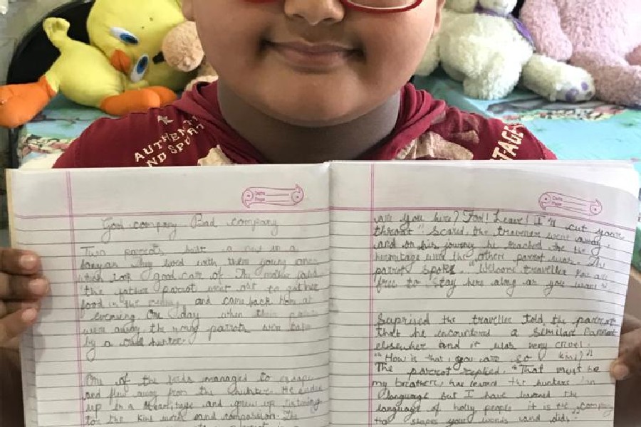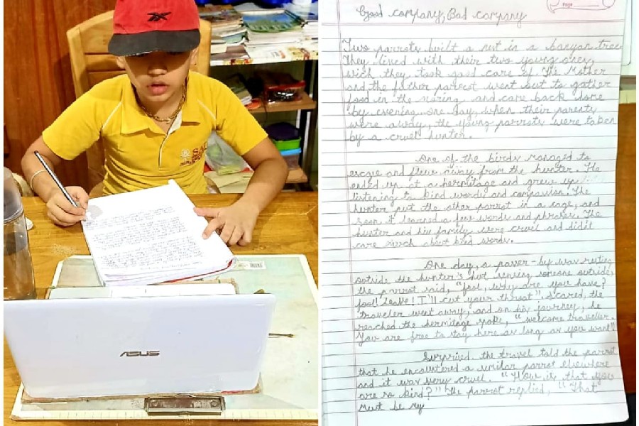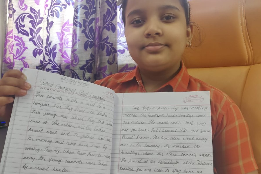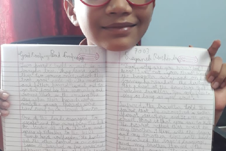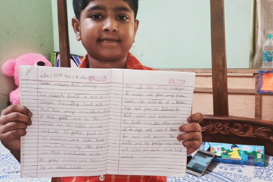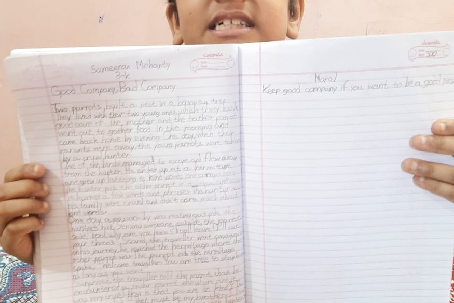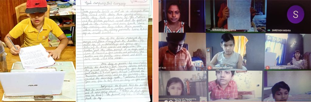 The students of Class III participated in a virtual handwriting activity. A paragraph was shared on-screen on the spot and the time limit was 45 minutes. The students used single-ruled copy to copy down the paragraph which was a moral story about good company and bad company. The kids were told to choose either cursive or print letters to write down the paragraph.