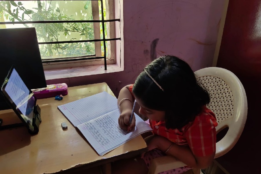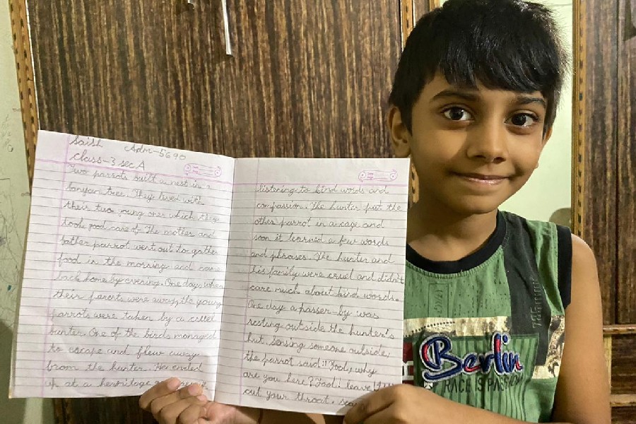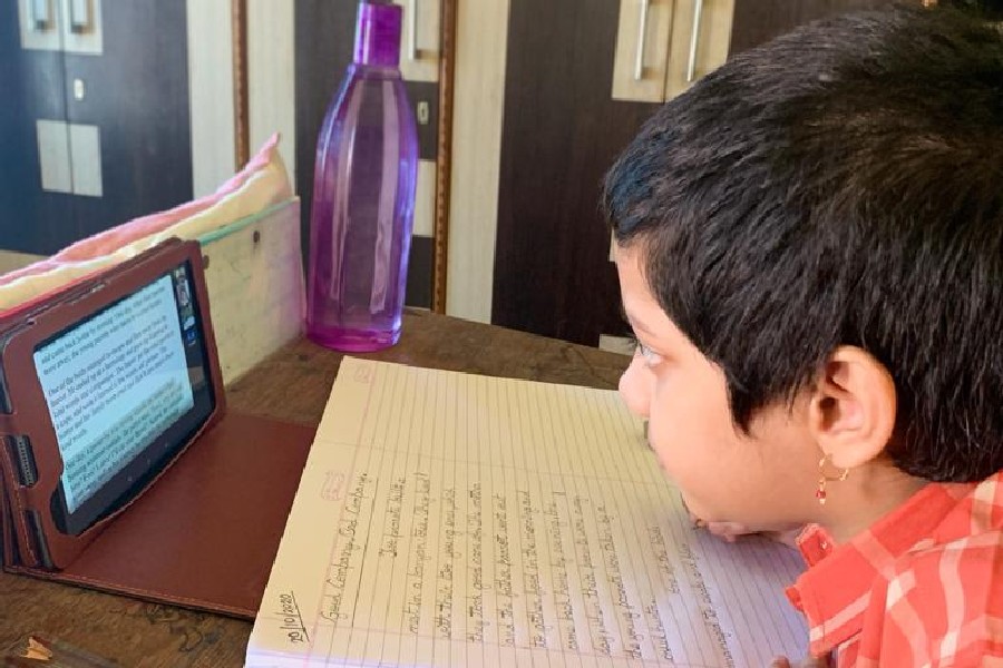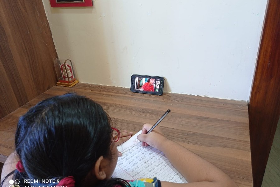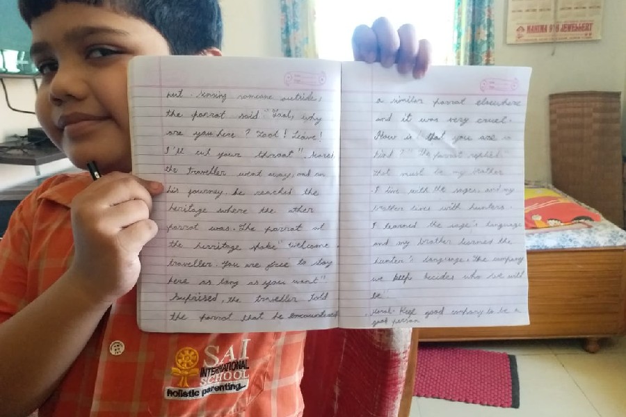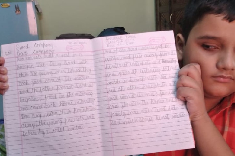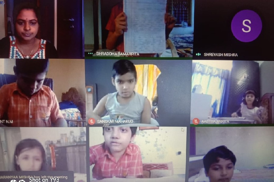 The students of Class III participated in a virtual handwriting activity. A paragraph was shared on-screen on the spot and the time limit was 45 minutes. The students used single-ruled copy to copy down the paragraph which was a moral story about good company and bad company. The kids were told to choose either cursive or print letters to write down the paragraph.