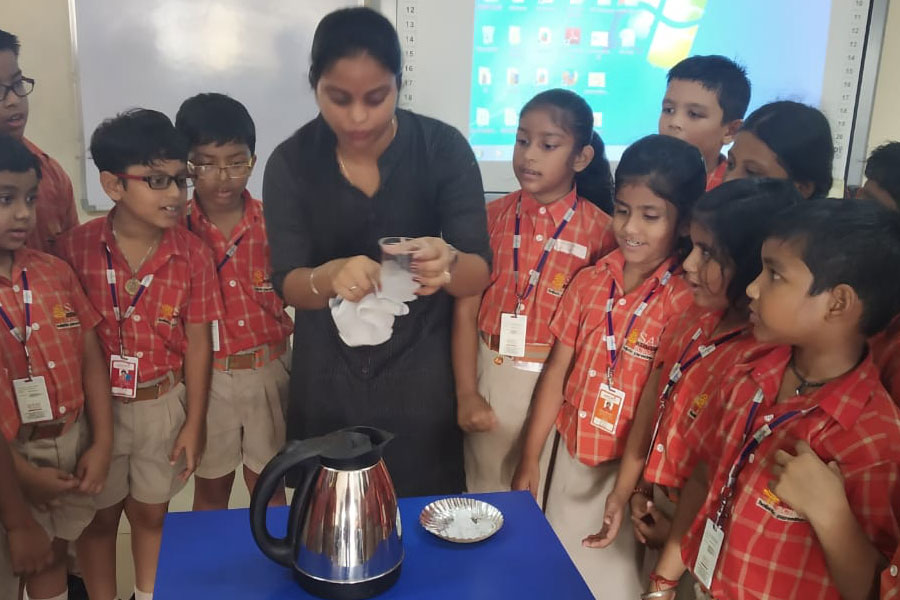Different sources of water, uses of water, solubility of water, different forms (states) of water were taught to them by involving them practically. All the three states of water: solid (ice), liquid (water) and gas (vapour) were demonstrated. Even though students come across these states in their daily lives, but this experience with their friends in the classroom was something different for them. Their direct involvement makes it interesting as well as fruitful.