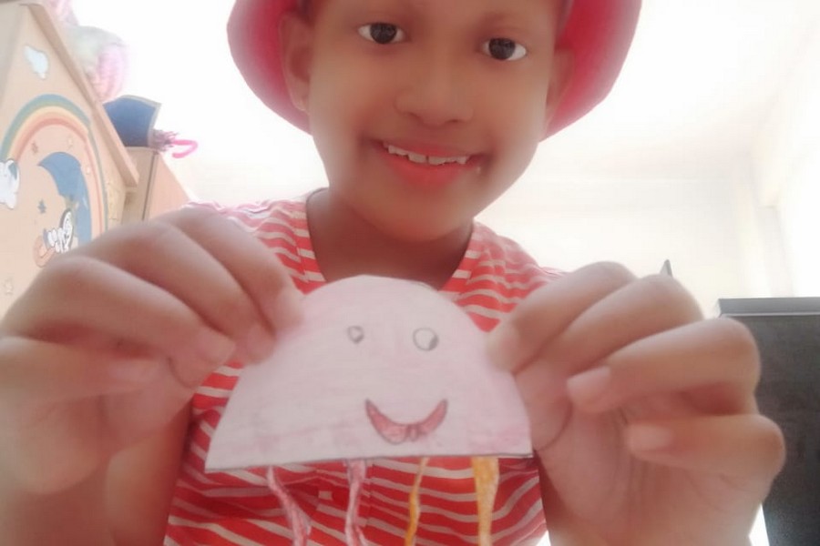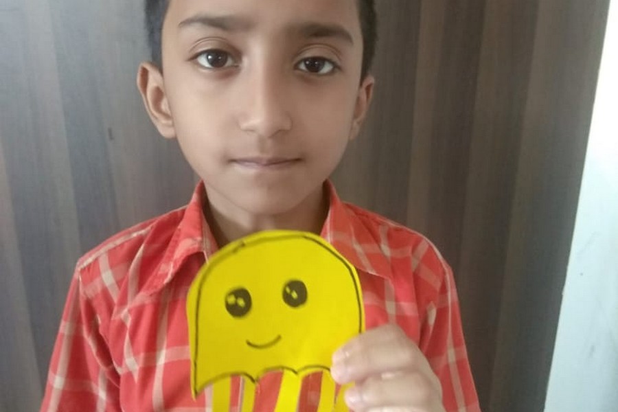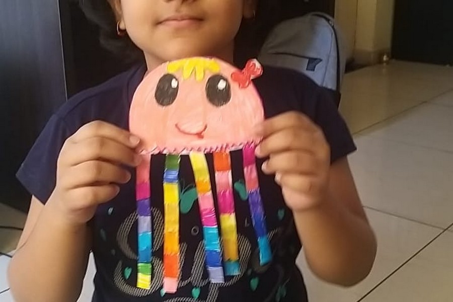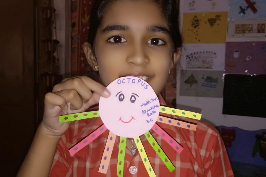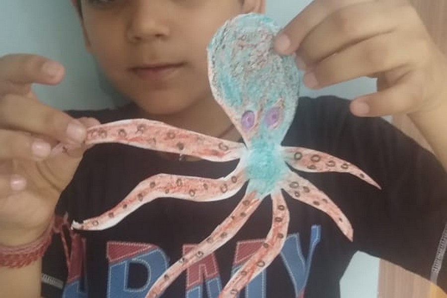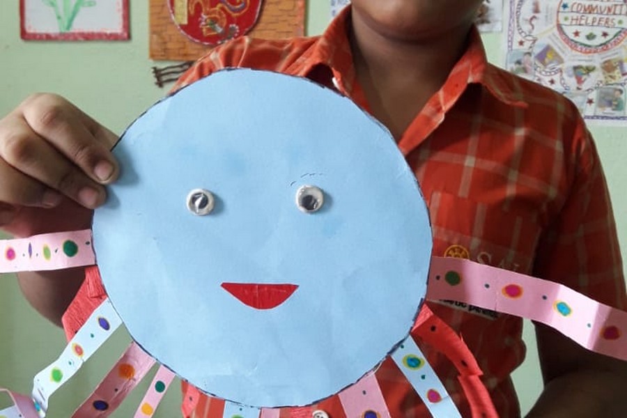 Today, the children of Class-III were involved in making sea creatures wherein they used colour chart paper and colour strings for making Octopus, Jellyfish and some also used paper cutting to make Dolphins. These creatures made by them looked very beautiful and colorful. These activities developed their skills of art and craft which was helpful for them.