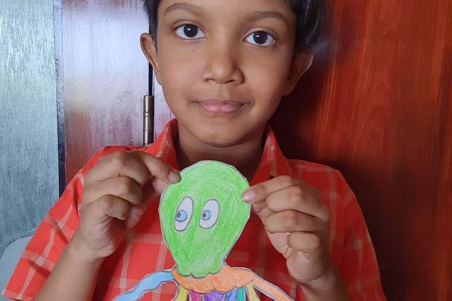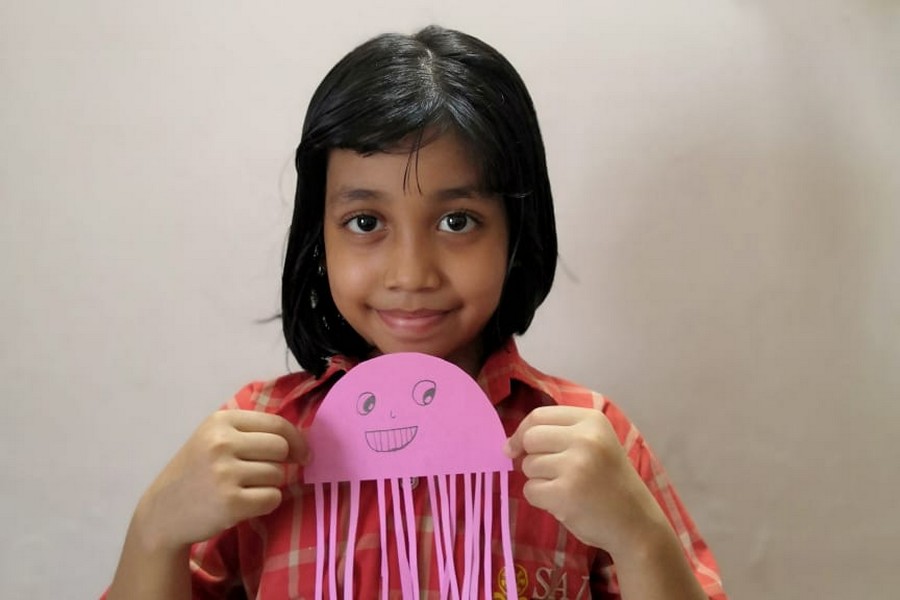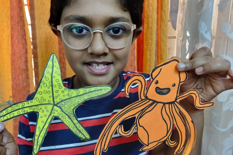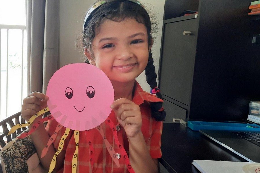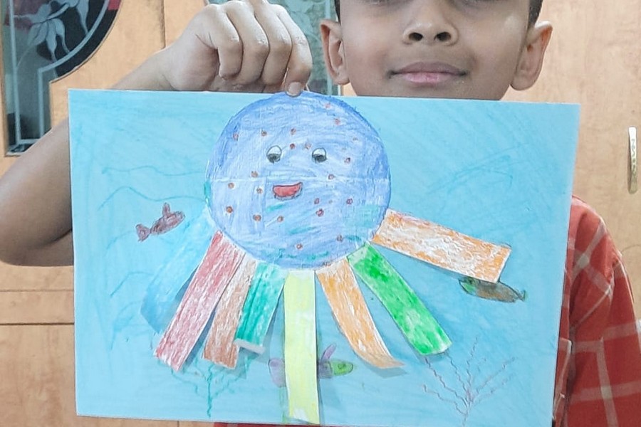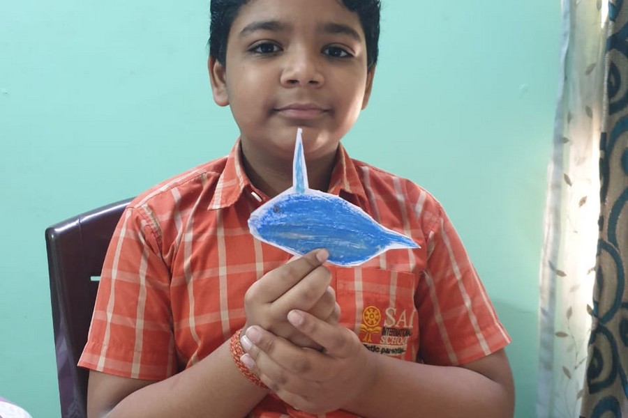 Today, the children of Class-III were involved in making sea creatures wherein they used colour chart paper and colour strings for making Octopus, Jellyfish and some also used paper cutting to make Dolphins. These creatures made by them looked very beautiful and colorful. These activities developed their skills of art and craft which was helpful for them.