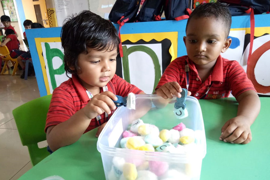 In the next activity children were given cotton balls on which letter sounds were pasted and they were instructed to pick up the cotton ball with the help of a cloth pin and enact the respective letter sound. At the end of the activity, children were confident about the letter sound with proper action. These activities helped them to enhance their fine motor skills.