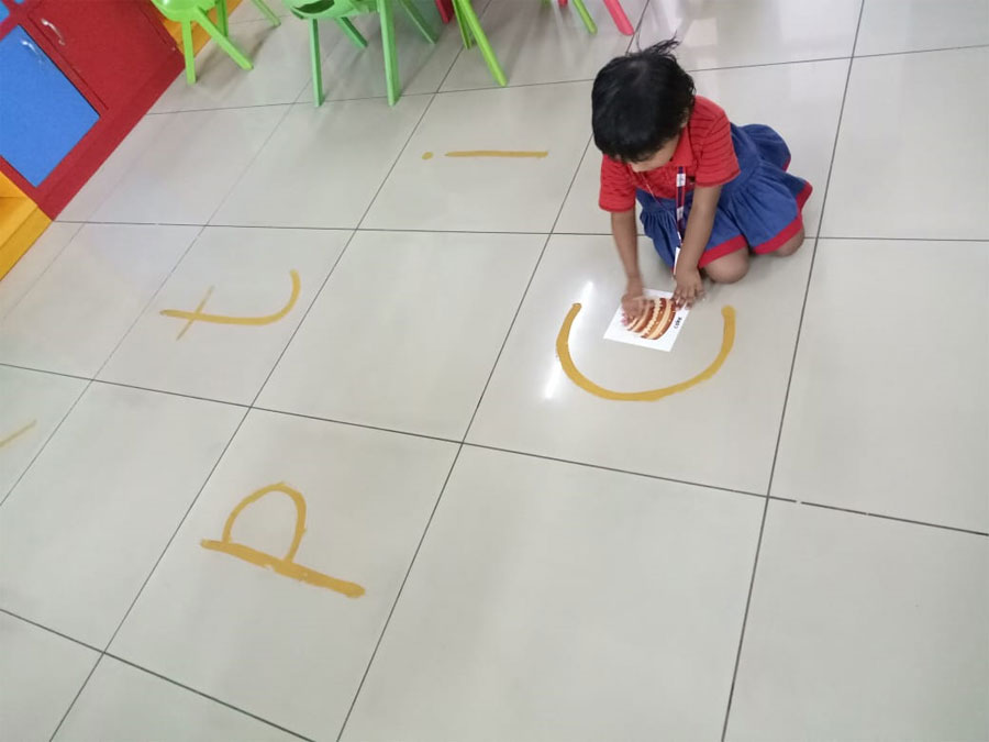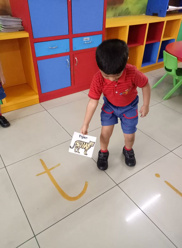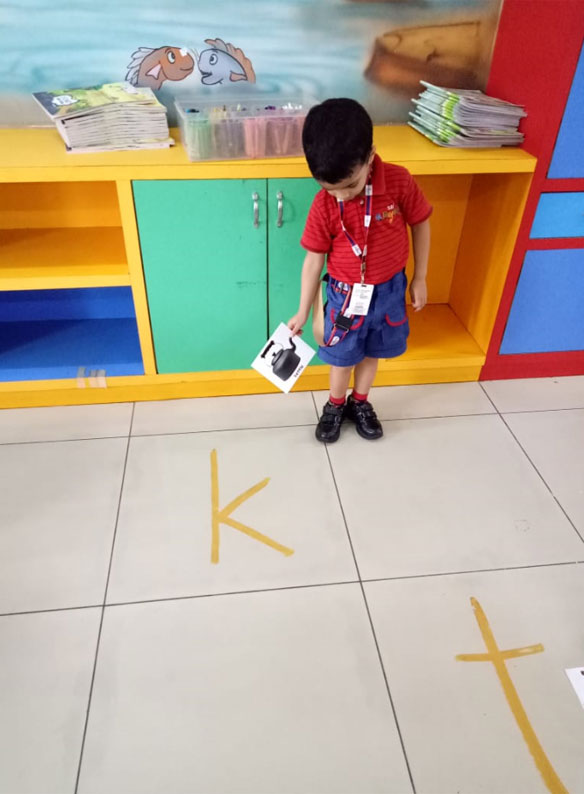 An activity was conducted in which the letter sounds were written on the floor and children were given flash cards and were told to place the cards on the appropriate letter sound.