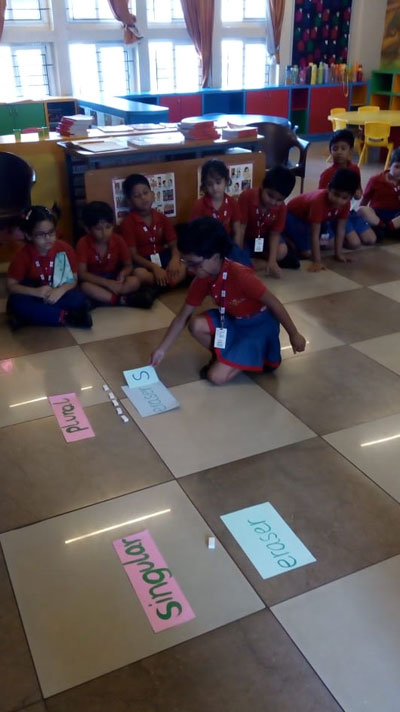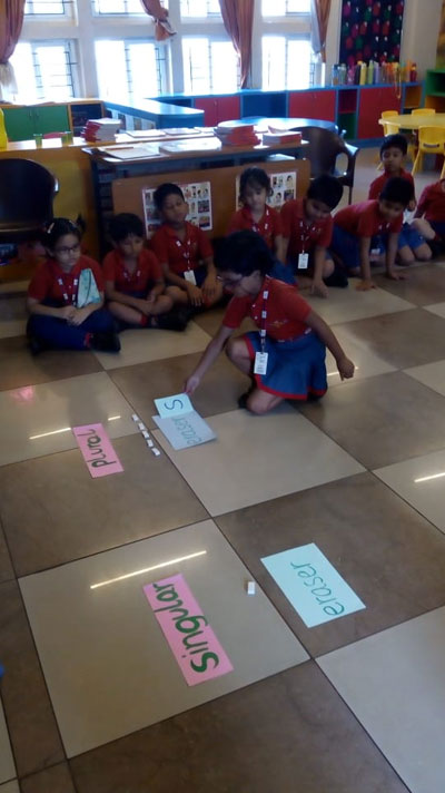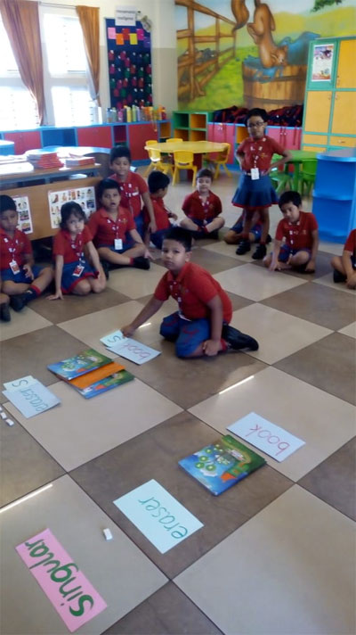 In order to make the topic interesting, the children were given real life objects used by them in the classroom and were asked to place the greedy ‘S’ beside the Plural group of objects. This activity helped in enhancing their fine motor, linguistic and kinesthetic skills.