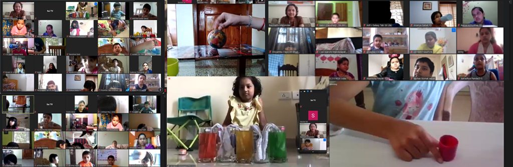 SAIoneers were asked to keep ready the ingredients for experiment beforehand. The children took three glasses with one cup of water each. Next they added a few drops of one particular food color to one of the glasses, similarly they added two different colours of food colour to the other glasses.