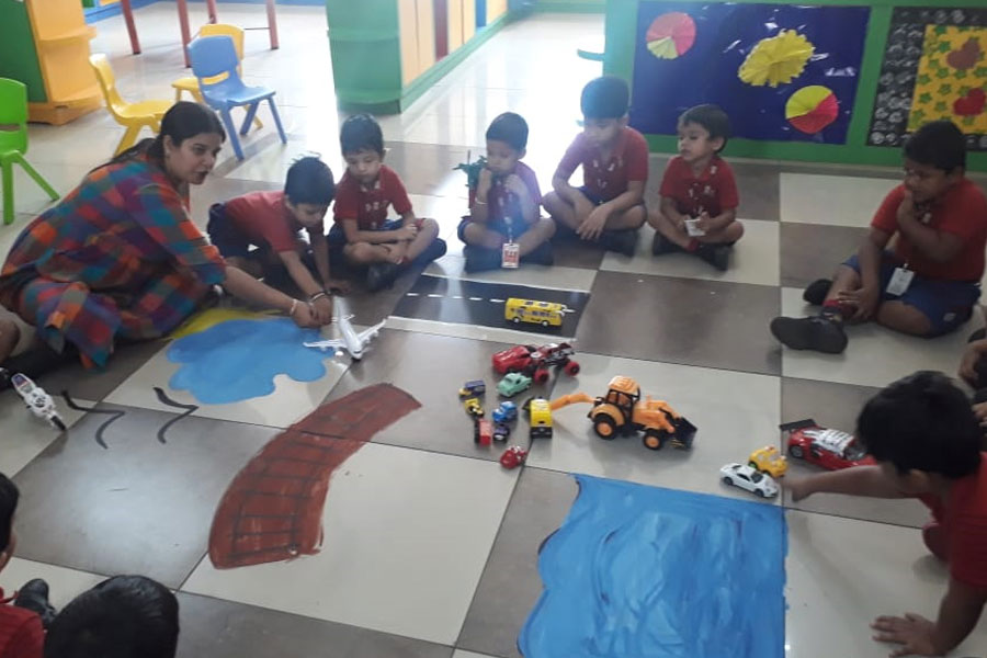 Then the little ones were given few toy vehicles and asked to differentiate between the land transport, water transport and air transport by placing the toy vehicles on the appropriate picture drawn on the floor.