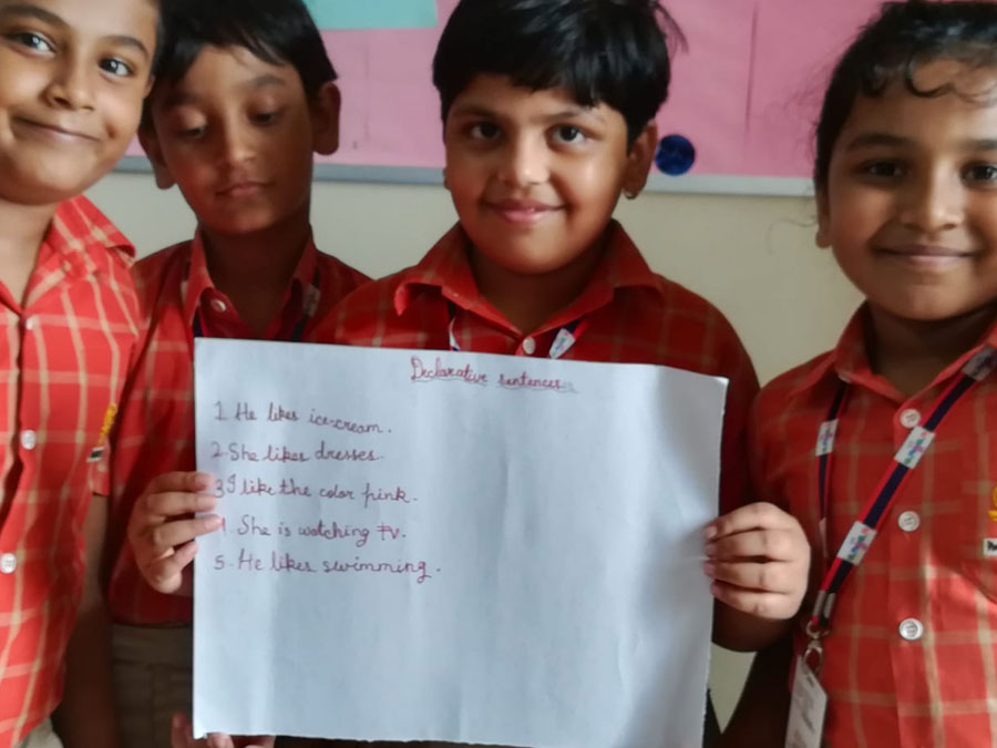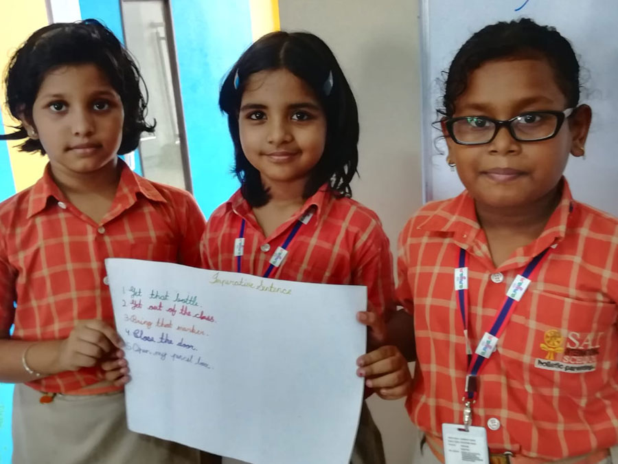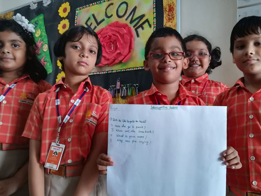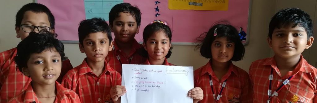 Each activity at SAI Angan is meaningful and ensures optimal development of students by engaging them whole heartedly in learning activities. Through a thought provoking activity, students of Class-III learnt how different types of sentences are constructed for effective communication. Students were divided into different groups and assigned a task. Each group was asked to form four different types of sentences like state something, ask a question, expressed some emotion or gave an order. Students could complete the task successfully and were able to change the tone of sentences by switching out the punctuations. This activity helped them in strengthening their writing skills. Students also gained an in-depth understanding on the four types of sentences that are used in writing – declarative, exclamatory, imperative and interrogative as well as how each type is used in a specific situation and has its own punctuation mark.