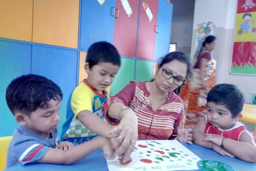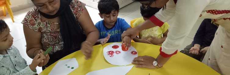An activity was conducted where the children were asked to dip the vegetables in poster colours and print it on the respective vegetable cut-outs. This helped them to relate the vegetables with their name, picture and the real one. This activity also helped in enhancing their naturalistic, fine motor as well as linguistic skills.